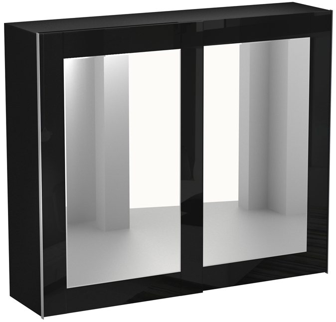 Шкаф-купе декорирован зеркалами и окрашенным стеклом. Изделие имеет четыре отделения: два отделения с полками для хранения одежды, два - со штангами для одежды. Шкаф оборудован встроенным комодом с шестью ящиками. Изделие комплектуется фурнитурой Cinett.